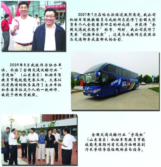 2009年8月我校作為協(xié)辦單位,承接了全國交通運輸行業(yè)“宇通杯”(山東賽區(qū))機動車駕駛員節(jié)能技能競賽工作。大賽以優(yōu)質(zhì)熱情的服務(wù)贏得了主辦單位和參賽單位及個人的一致好評,被授予特殊貢獻獎。