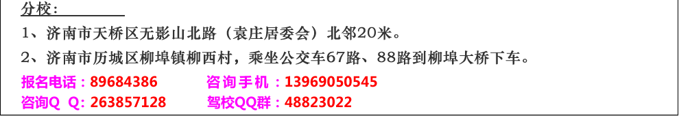 學(xué)車報名電話:13969050545    業(yè)務(wù)咨詢熱線:0531-89684386    學(xué)車咨詢QQ:263857128
